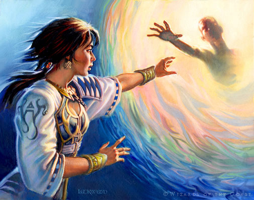 A mortal again for the first time in a millennia, Teferi lacked the power to seal the other rifts. Even worse, the planeswalker Jeska, Warrior Adept, manipulated by evil forces, forced Radha to act as a buffer as she sealed the rifts. Before Teferi could return Zhalfir to the time stream, Jeska used Radha to seal the rift, leaving it forever beyond his mortal reach. The loss weighed heavily on his soul. Even The Mending of Dominaria causing a rebirth and rejuvenation of the plane could not assuage the depth of his guilt.