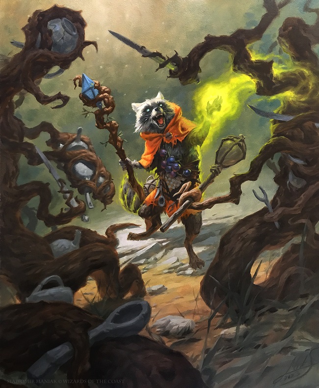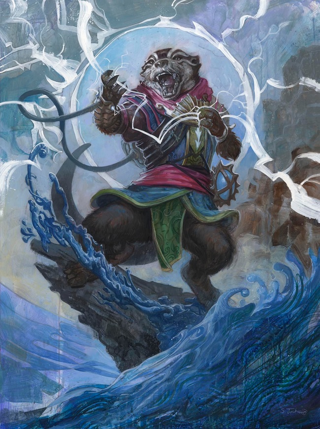 Overprotect is my favorite 'fun' card in the set. It's a frogfolk who has gone a little overboard protecting themselves. Polliwallop is a play on polliwog, the stage in a frog's development cycle. Wear Down is a beaverfolk who apparently has a thing for chewing down trees holding birdfolk aeries. Tangle Tumbler is a katamari (for those of you who don't know, Katamari is a cult classic video game about creating a giant jumble of junk). Jacked Rabbit is a play on Jack Rabbit, except this one is muscle bound (which is often referred to as being jacked). Finally, Rolling Hamsphere is quite literally a Hamster Ball in the style of Myr Battlesphere, and I love it.