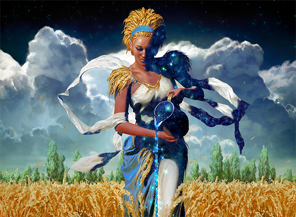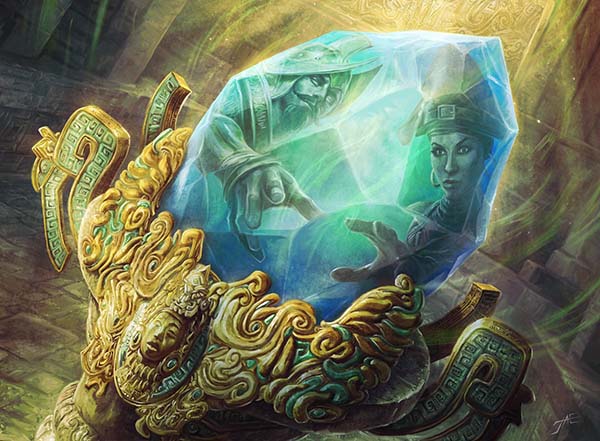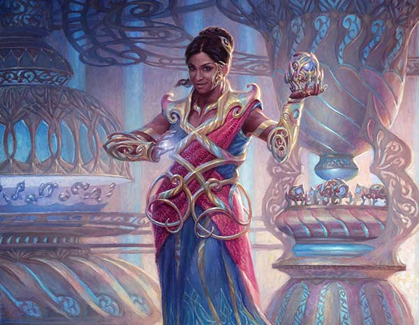 Saheeli Rai hasn't been gone for long, just recently re-appearing at the end of Rivals of Ixalan to discuss creating dinobots with Huatli, Radiant Champion. That's okay in my book, though, as Wizards uses her to great effect as the face of the artifacts-matter deck. What's great about this piece is that Ryan Pancoast did his homework. Shivam Bhatt lays out the Indian and Hindu influences evident in the artwork on his blog, but it's clear that Ryan gets the subject matter and has infused his Kaladeshi pieces with a little more than the usual costuming.