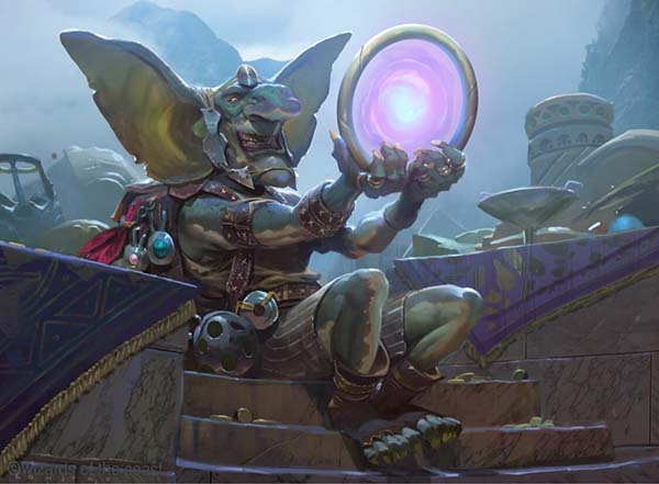 Treasure Nabber is a fun piece. The wide, bat-like ears indicate a goblin from Kylem. The art itself shows a Sol Ring in its grasp, and if you couldn't figure out the purpose of the card, this should tip you off! It's a great meta nod.