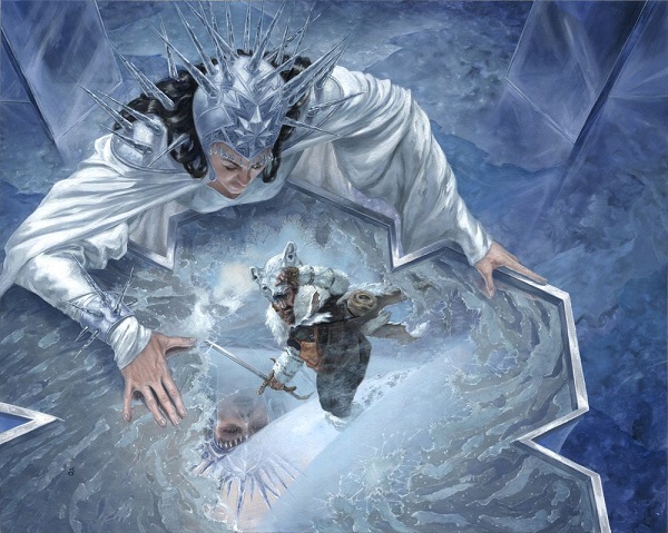 Hylda of the Icy Crown is our White-Blue Ice Queen (you know, like in Frozen), and those colors are all about her ice kingdom. Basically, Hylda showed up and did magic to Plunge into Winter and create a Solitary Sanctuary: