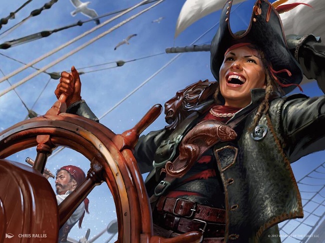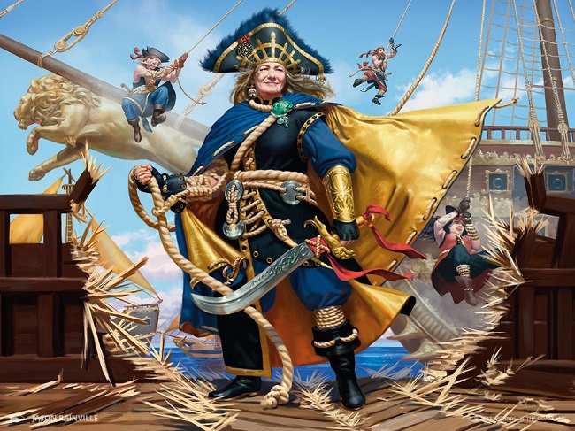 Admiral Beckett Brass was the legendary pirate captain of the Scourge, one of the ships that would go on to found High and Dry, the floating Pirate City made up of docked and derelict vessels. After the Scourge crashed into and entangled another pirate vessel, their captains came to an accord, and the loose coalition that would become the Brazen Coalition was formed. Brass is now the admiral of the Fathom Fleet, the most fearsome pirate fleet on Ixalan.