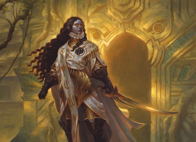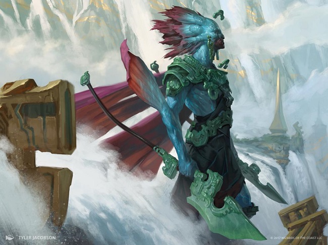 Among the River Heralds of Ixalan, most shamans feel close affinity with the winds and waters, or with the verdant growth of the jungle. Tuvasa believes the light of the sun is the power that unites them both, giving life to plants and warming coastal waters.