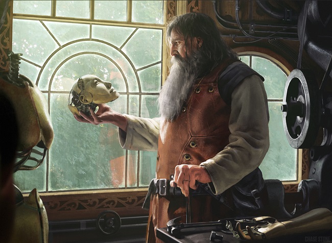 Urza's side relied on their aerial advantage through Urza's thopters as well as Urza's mechanical soldiers. In the new set, Urza's machines are notable for their bulbous, steampunk plate armor designs.