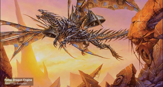 Millennia later, the Weakstone in Mishra's possession resonates with one such dragon engine long buried in the desert sands, awakening it and become the first real weapon in Mishra's arsenal, and his path to power among the Fallaji. When it becomes clear that Urza has more ornithopters than a single dragon engine can handle, Mishra heads through the portal to Phyrexia to claim three more.