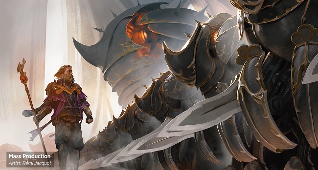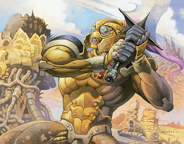 The back-and-forth of the Brothers War meant a constant arms race as each side attempted to one-up the other's latest weapons. Early on, Urza adapted the Su-Chi, a bipedal but slightly insectile artifact design from the Thran, into an automaton that could move around a heavy rock. When it became clear war with his brother was inevitable, Urza created gigantic mechs steered with control rods, called Urza's Avengers. The original art, obviously, leaves much to be desired, but we see updated modern art of a similar vehicle in Sword One, one of the "Past" episodes from The Brothers' War story. And possibly it's already been previewed by the time you read this, but I'm writing this before preview season.