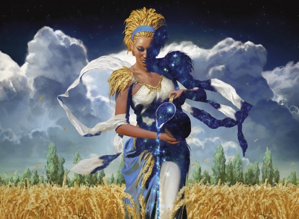 Kydele is an oracle of Kruphix. She was captured by Xenagos, the Reveler, but revealed that she was only there to spy on the satyr planeswalker for her god and disappeared. Since then, she's returned to the edge of the world where she sits by Kruphix's side. She is one of the few mortals in the world to know the truth about the metaphysics of Theros and that there is a wider multiverse, as Kruphix is quite candid with her.