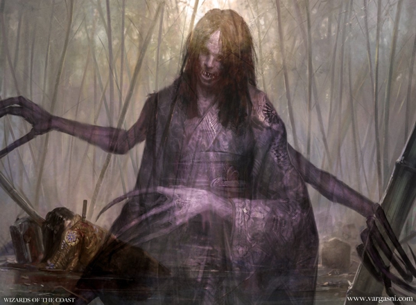 A goryo is a vengeful ghost, and this updated art changes the subject of the art from a random oni to a young woman. I love this new version of the art, as it's much more evocative of Japanese horror, although it retains some nice touches from the original like extra limbs. This art is much more 'readable' than a lot of the kami art from Kamigawa while staying true to the aesthetic. Also, check out the murder weapon, this poor vengeful spirit was stabbed in the back.