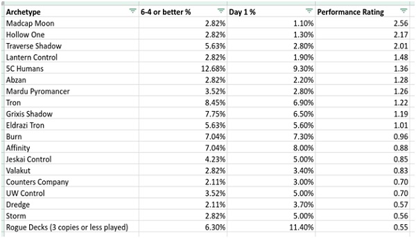 Finally, the "Performance Rating" is a metric that I created to compare an archetype's 6-4 or better finishes with its starting portion of the field. Specifically it is: