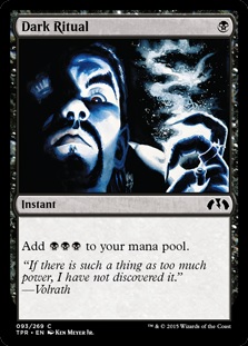 Culling the Weak is exceptionally powerful as far as rituals go and it is the reason for our odd Green creatures. It turns one mana into four which allows us to cast a draw four while still leaving a mana floating. Dark Ritual is probably the best ritual ever printed to date as it simply turns one mana into three without any extra work. Cabal Ritual not only generates extra mana for us, but also gives us a nice way to turn extra Red and Green mana into Black so it can be used to play draw fours.