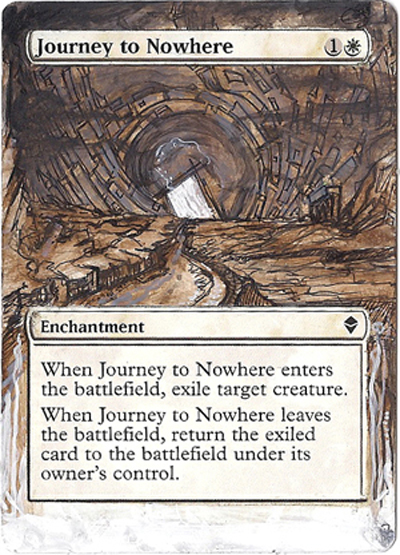 One of my favourite cards when it was a Standard staple, Journey to Nowhere, has been given an interesting makeover by OndalTheFool. Ondal always produces crazy, interesting pieces with a plethora of line work, and this is no exception. This alter kind of reminds me of Stargate. It’s as though there’s this mysterious, ancient door at the end of a nigh impossible journey just sitting there, daring you to enter.