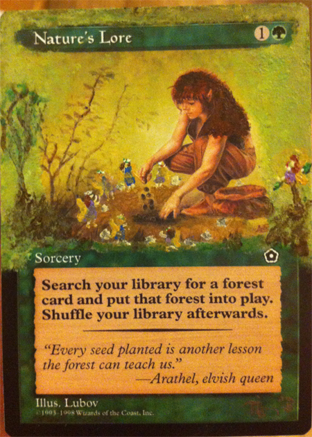 This is better than most first unguided attempts I see, so I was quite pleased. The image made her think of faeries for some reason, and it’s been well documented that faeries gather to make faerie rings, generally around a mushroom. If you read the Lorwyn book series, this should sound familiar, but these myths were around for far longer than Magic has been. Regardless, I was proud of her, and I slotted the Nature's Lore back into my Commander deck.