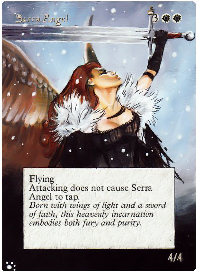 Probably the longest-serving card alterists are the couple from Vancouver who form CardKitty. Eva and Dereck have been altering Magic cards of the highest quality from the very beginning, and their cards are always recognizable by the soft color transitions (and paw, of course). My favorite of their December alters was this Serra Angel. Again, we’ve seen Serra done a million times, but this dark, Innistradesque approach is quite refreshing. The pen work on her shoulder fluff is a little much for my liking, as it tends to draw the eye, but besides that, I love this piece.