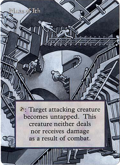 I’m sure you’ve all seen this image floating around the internets by now. The Escher Maze of Ith from Eric Klug really made some waves in the altering ocean last month, resulting in what I’d imagine is the highest price ever paid for a non-Magic artist alter ever. Three days after I tweeted my Dr. Seuss Maze, Eric stomps me with this piece and then puts it up for auction. At the end of the auction, this piece netted $625! The image is certainly fitting of the card and, like all of Eric’s work, extremely well executed. Now, if you could just turn back time and not do that phallic Sliver Queen . . .
