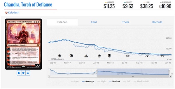 I've adjusted the time line a little to show its peak and its valley. Most cards late into their Standard life cycle will slowly decline. If decks remain largely the same (as they unfortunately did for a lot of the KLD/AHK/XLN Standard) then there is no new demand and they will naturally decrease in price. You'll see in February 2018 a leveling off and then a cliff dive. That's when full Challenger decklists were revealed and the card started to free fall. It's not unusual for a card to decline but it is unusual for a format staple mythic to decline so quickly. Chandra fell from $30 to $25 within a week and then $20 by the time the Challenger decks were released. As the single most expensive card in all of the decks it is pretty surprising to see a 30% drop in price leading up to the release of the card. What is also very important is that due to the timing of the release of these decks, none of the cards have the lifetime left in Standard to rebound after the decks sell out. The price decrease is more or less permanent for the remainder of their stay in Standard.