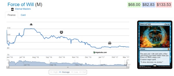 Force of Will’s price graph is definitely the trajectory I’m expecting for most of the Modern Masters 2017 mythics. They may have a pretty steep price drop the weekend of release and then a rebound as stores purchase copies. After a month or two it will be relatively stable. There is a chance that they do another Modern Masters 2017 print run around Christmas like they did with Eternal Masters but I wouldn’t count on it. If you want to get into the Tarmo-Liliana decks you will have your best chance once Amonkhet is released.