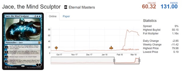 This is the price graph from MTGGoldfish for Jace's price on MTGO. Players have a lot more fluidity to change decks as their mood or play-testing shows a deck is performing or not performing well. I'm afraid of Jace almost exclusively dropping since it was unbanned. This leads me to believe that players don't want to play Jace decks because they're not fun or not good. I sold my Jaces already when the spike first happened, but if you were holding onto them because you were late to sell, then now is probably the time to dump them before you lose more.
