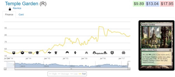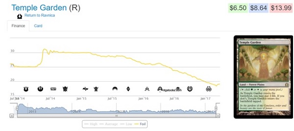 Temple Garden was part of the first series of Expeditions and has the longest price history to look at. The dip of its foil price started a little early but continued to decline since it was released as an Expedition. Clearly this was the cheapest version available before Expeditions so let’s take a look at the much rarer, Ravnica: City of Guilds foil.