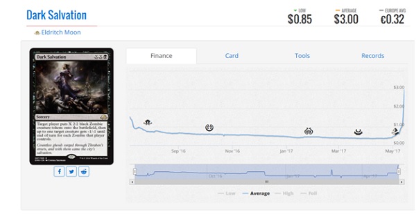 Well the mindless horde was pretty successful this weekend as its resilience allowed it to outlast control decks and it’s speed and efficient removal allows it to run over Mardu Vehicles. This deck looks like it will be a major player in the format for the next 2 months and the prices reflect that. In the past two weeks, Dark Salvation, Cryptbreaker, Relentless Dead, Diregraf Colossus, and Metallic Mimic have all seen pretty large gains and reached an all-time high over the weekend. What does that mean for the average player? Well if you want to play Zombies for the next 2-5 months then they’re probably going to be good and probably won’t get cheaper soon. Alternatively, if these cards have been rotting in your binder then this will be the best week to sell them off before they start to drop. I had a lot of these zombie cards that I sold this past week because I wasn’t sure they were going to show up in the numbers at the Pro Tour necessary to continue to climb. Given the fact that Gerry Thompson won the whole thing with the mindless horde, I think we still have a week or so of climbing.