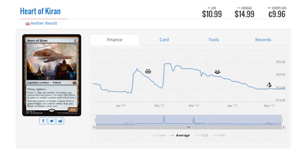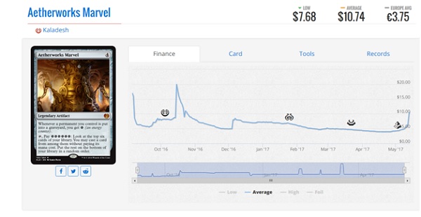 This is the second Pro Tour featuring the ever popular energy to Ulamog, the Ceaseless Hunger conversion machine. Many players may not be happy with the power and speed that it brings to the game but you can’t deny its effectiveness. As you can see from the price graph, people have forgot that it’s a card twice now and we’ve had some pretty big spikes after it performs well at a big tournament. Aetherworks Marvel is the first card that will not fall off immediately but unlike the zombies cards, it will not rotate out of Standard in the fall. When Ixalan is released, the best target for Marvel, Ulamog, the Ceaseless Hunger will be leaving Standard and definitely dull the shine of playing Aetherworks Marvel. We have seen decks playing it as a value card and just finding Whirler Virtuoso, Rogue Refiner, and Torrential Gearhulk so I’m not sure it will be retired as soon as the zombies. As such, if you’re interested in playing them I would probably wait a week or two for the price to come back down a little bit. The buy in isn’t the same as the zombie cards because it’s legal until Fall 2018. Other cards in this deck are actually pretty inexpensive as the energy cards are mostly commons and uncommons. Ulamog, the Ceaseless Hunger is the most expensive and biggest spike on the weekend but it has a lot of long term value. It will probably never be less than $10 due to popularity in EDH and casual decks.