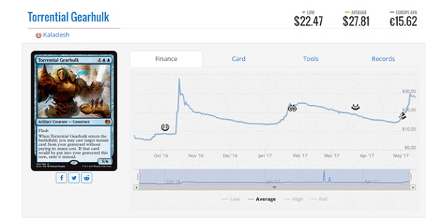 When I say Torrential Gearhulk decks, I think you know what I’m talking about. The Blue and Red and sometimes other color decks with lots of counter spells and Gearhulks just isn’t good right now. Those decks made up a very small part of the metagame at the Pro Tour and can’t fight zombies and Aetherworks Marvel because they require two very different approaches. The fact that zombies has so many Glorious Anthem style effects in Liliana's Mastery, Gideon Emblem, Lord of the Accursed, and Metallic Mimic causes a lot of issues for Red based removal which tends to synergize best with counter spells. Unless we get some new and better removal spells in Hour of Devastation, I don’t foresee Torrential Gearhulk being a mainstay in Standard until rotation. As you can see from the price graph, there is always a slow dip right after a spike so you have time to buy in again later if you decide it’s something you want to do. For now, my verdict is sell!