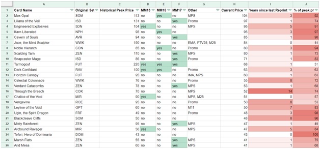 I'm not sure how well this picture will show up in the article and on mobile so here is a link to the spread sheet. I used historical and current pricing data from MTGstocks.com to create a list of the top 25 most expensive and most popular cards in Modern and I left off a number of expensive cards that aren't played very often in Modern. This includes Sword of Fire and Ice, Bitterblossom, Sliver Legion, Doubling Season, etc. These prices may vary from store to store and may even be wrong as this article goes up. What I'm trying to illustrate is how reprints affect the price of popular cards.