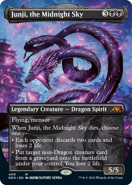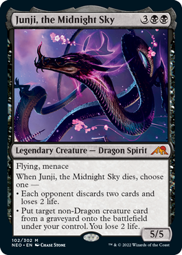 Kamigawa: Neon Dynasty continues this tradition with a new cycle of five legendary spirit dragons, and heir to Kokusho's Throne is Junji, the Midnight Sky!