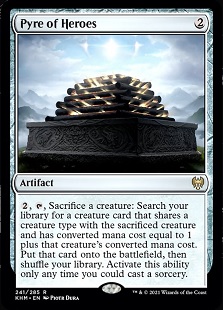Pyre of Heroes is quite the Birthing Pod homage, again falling in line with the tribal nature of Kaldheim. With Birthing Pod often costing three mana to play and one to activate (and some phyrexian life), while also being banned in Modern, the fact that Pyre of Heroes costs roughly the same is quite the endorsement.