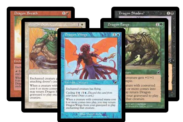 In the Budget Box, we lose access to big finishers like Craterhoof Behemoth, and (most of) the Eldrazi. Instead, I’ve filled these slots with creature threats that cost six mana or more. There are many cycles that to pick from to construct our top-end. I picked a sampling from these cycles; Primordials, Soul of . . . , and the Kamigawa Dragons. I also considered the Titan cycle for cards like Grave Titan, and Inferno Titan, but in the end none of them made the cut, because of space and cost. I wanted to make the top end a touch more powerful, so I’m experimenting by adding the “Dragon Aura” cycle from Scourge. These Auras come out of the graveyard and attach to any creature with a mana cost of six mana or higher. My dream is to see all of five of these come out of the graveyard, creating a Frankenstein-esque killing machine!