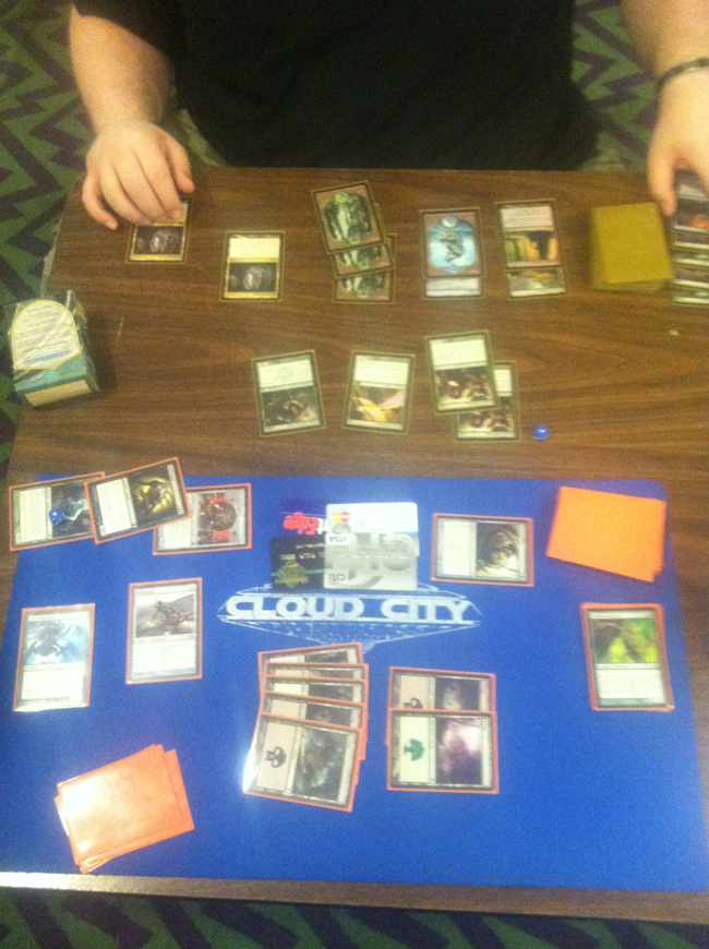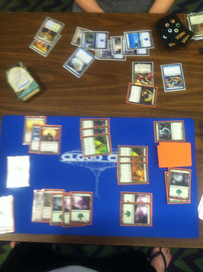 Both games end pretty similarly: I have a lot of creatures in play, and Ben just straight runs out of Fogs. The credit cards on the table in Game 2 are supposed to be Myr tokens.