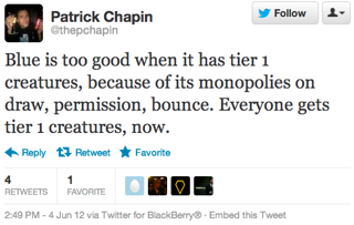 It’s worth mentioning that there is a steadily growing set of players who don’t go in for the self-expressive side of Magic so much; they’re mostly in it for the competition. But I’m not talking about them. I’m talking about the people complaining about Standard, and you won’t see any of the hyper-competitive guys complaining about the existence of a streamlined, efficient, de-facto, number-one deck any time soon. I’m talking about the guy who plays in FNM, and then, on the weekend, watches SCG coverage, which in turn encourages him to get a Twitter account so he can join in on the conversation.