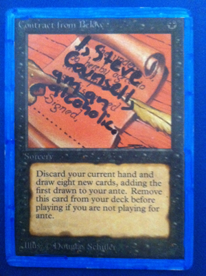 That is a Contract from Below. I was very shocked to receive an Unlimited card in the mail. CoolStuffInc has it at $3, so, not the most expensive card I’ve ever done, but good enough to get me nice and nervous. Fear is a great way to breed creativity I’ve heard. Then, I read Contract from Below.