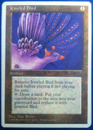 Jeweled Bird seems to be a pretty good card in the five-color ante format—you get to draw a card, no matter what your mana situation is (which is probably nice because I’m sure you just get color-screwed in this format a lot), and if you have one or more expensive cards in your ante, you can always just switch them with the Jeweled Bird. However, this makes it so Steve’s opponent can take the Jeweled Bird if he wins, so, y’know, can’t make this one too good, or else his opponent will play really hard to win it! Or something like that.