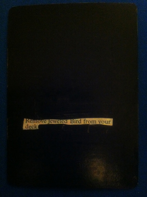 When I was a kid, I used to go through the morning paper and try to cross out letters and words in columns in order to make funny messages. Combine that with my propensity for waking up early and . . . yeah, I was not a very welcome overnight guest at my grandparents’ house. I guess when I did this, I was channeling that, and I took it too far and blacked out the rest of the card completely. My realization of the fact that the card was probably going to go to someone else at some point probably factored in the anger I so clearly took out on this Magic card. I am an idiot.