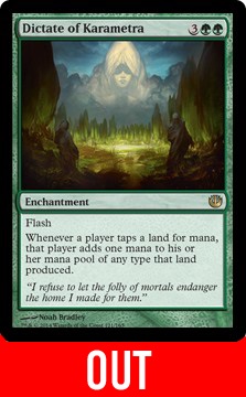 The one change that I will make in this area, is to swap out Dictate of Karametra with Heartbeat of Spring. In my opinion the Flash ability is not worth 2 mana, and this change allows players to play this effect earlier which is in line with our current focus on sculpting the early game.