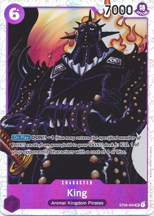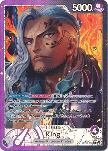 King is a purple/black leader with standard stats of 5000 power and 4 life. His ability reads: "[Activate: Main] [Once Per Turn] DON!! -2 (You may return the specified number of DON!! cards from your field to your DON!! deck.): Choose one: If you have 5 or fewer cards in your hand, draw 1 card.
