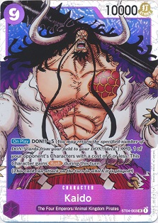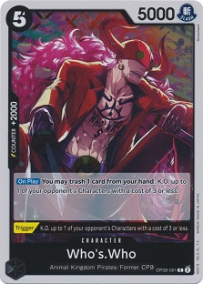 Kaido removes a 7-cost or less character and reduces the opponent's hand size at the cost of one of your cards. Queen searches for Animal Kingdom cards in black. Who's-Who has a +2000 counter and a removal On Play effect.