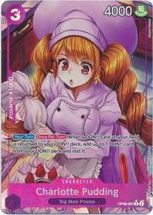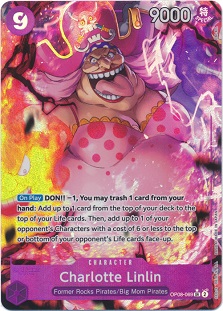 Charlotte Linlin (9-cost, 9000 power) adds life cards and moves one of your opponent's characters to their life. Charlotte Pudding (3-cost, 4000 power) allows you to ramp DON!! even further.