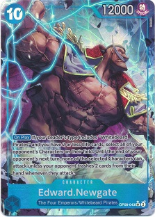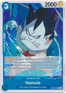 In summary, Namule is a blocker with "[Blocker] (After your opponent declares an attack, you may rest this card to make it the new target of the attack.) [On Play] Draw 2 cards and place 2 cards from your hand at the top or bottom of your deck in any order." This ability allows you to manipulate the top of your deck and provides a blocker and card draw. Portgas D. Ace is a midrange threat with 6000 power that allows you to play a Whitebeard Pirate character with a cost of 4 or less from the top of your deck without paying any DON!! for it. Edward Newgate, on the other hand, is a 10-cost, 12000-power character with a powerful effect akin to Propaganda from Magic: The Gathering.