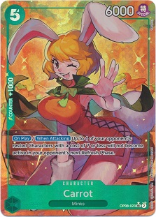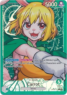 Carrot is a green leader with standard stats of 5000 power and 5 life. Her ability reads: "[Activate: Main] [Once Per Turn] If you have a {Minks} type Character, rest up to 1 of your opponent's Characters with a cost of 5 or less." This ability, while limited, is useful for resting blockers or valuable opposing characters. Key targets include:
