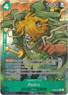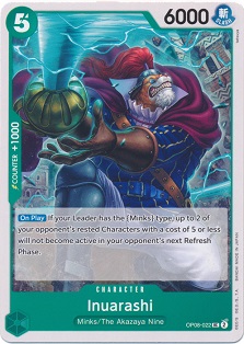 To summarize, Carrot stops you being attacked by opposing characters with a cost of 7 or less ON PLAY AND ON ATTACK by keeping them rested. Inurashi, much like Carrot character, has an On Play that keeps two of your opponent's characters with a cost of 5 or less from becoming active during your opponent's turn. Pedro has a lot going on with him outside of just being a blocker; Pedro also has a versatile ability of "[On K.O.] Choose one:
