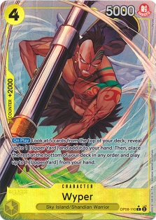 Unlike Arlong, this leader decided to stay within the Yellow color instead of dipping into another. Kalgara alone allows us to cheat out Characters within the Shandian Warrior character type while also rewarding your efforts by adding a card to your hand from your life cards; a high risk high reward approach after playing a character without utilizing any of your DON!! on the field. The ability to be able to reserve DON!! And still play characters from our hands can be VERY resourceful. This allows us to hold up Counters such as Burn Bazooka, El Thor, and "The Earth Will Not Lose!" when it comes time for your opponent to swing into you. You could even go as far as during your turn, swing in with Kalgara, cheat out Wyper with leader ability, search into an upper yard, grab a sky island character and then put out Enel for quick rush damage toward your opponent.