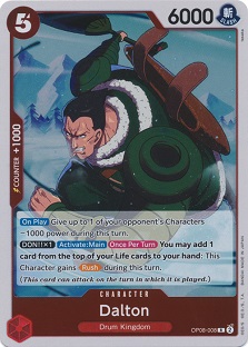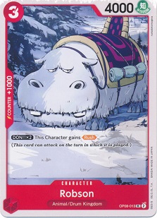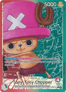 Chopper is a red/green leader with standard stats of 5000 power and 4 life. Unlike Marco, Chopper provides support for previously unsupported card types. His ability reads: "[Activate: Main] [Once Per Turn] Give up to 3 of your {Animal} or {Drum Kingdom} type Characters up to 1 rested DON!! card each." The closest leader ability we've seen to this is Belo Betty's, though Betty gives additional power rather than attaching rested DON!!. Chopper not only promotes the Animal card type but also introduces the Drum Island theme to the One Piece TCG. While there have been many Animal cards in OPTCG's history, Drum Island hasn't been fleshed out much. Some notable Drum Island characters include Dalton, Tony Tony Chopper (Character), and Robson.