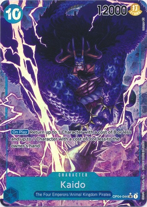 For starters, Kaido didn't make much of an impact when he was initially printed in Kingdom of Intrigue. However, we can heavily benefit from this card in Boa. Kaido is a 10-cost 12000 power character that says "On Play you can place one character with a cost of 8 or less and one character with a cost of 3 or less from the field to their owner hand." This is not limited to their characters, but also your own if you need another on play ability to trigger. But hitting one of their 8-cost or less characters making them wait an extra turn to swing with it? Seems pretty good to me.