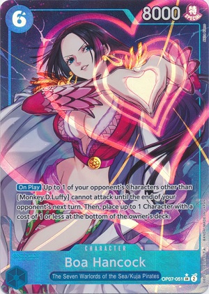 Of course, with Boa Hancock her own Character is an excellent inclusion in her deck. Boa Hancock - the character - is a 6-cost 8000 power character with an On Play that freezes one of your opponent's characters until the end of their next turn (unless it is Monkey .D. Luffy) and bottoms an opponent's characters that has a cost of 1 or less. The latter of the two abilities that trigger on play is most of the time irrelevant, but being able to stop ANY cost attacker from attacking for a turn and then you can freely swing in for 8000? Pretty darn good.