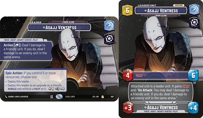 Asajj Ventress is a Leader with Grit that flips once you have 6 resources, with 4 power and 6 Health... OR, you can Flip Asajj Ventress as a Vehicle Upgrade with the ability "Attached unit is a leader unit. It gains Grit and 'On Attack: You may deal 1 damage to a friendly unit. If you do, deal 1 damage to an enemy unit in the same arena.'" Asajj also has a leader ability of "Action (Exhaust this leader): Deal 1 damage to a friendly unit. If you do, deal 1 damage to an enemy unit in the same arena." Asajj is an interesting leader that doesn't really benefit anyone except herself with her unit side but her leader ability promotes filling the deck with multiple cards with Grit.