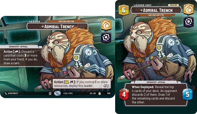 Admiral Trench has a leader ability of "Action : Exhaust this leader: Discard a card that costs 3 or more from your hand. If you do, draw a card.". Something unique to this leader as opposed to any other is that this leader can flip on a regular action, not an Epic Action. Meaning you can deploy this leader as a Leader Unit multiple times in a game. However, in order to flip Admiral Trench you need to control 6 or more resources, pay 3 resources, and exhaust the leader. Admiral Trench's leader unit is a 4 Power 5 Health unit with "When Deployed; Reveal the top 4 cards of your deck. An opponent discards 2 of them. Draw 1 of the remaining cards and discard the others." Admiral Trench is certainly a unique leader with plenty of loot effects attached to him. His ability that triggers on deploy reminds me ALOT of the magic card Fact or Fiction.