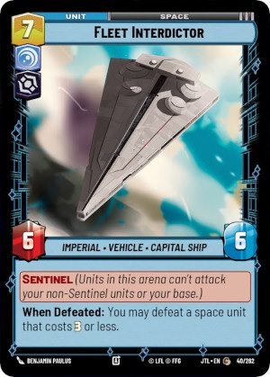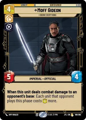 But it's hard to say what all cards go well with this leader considering how much he throws cards into the bin. I'd say a few cards from Jump to Lightspeed that go well with this leader are Invincible - Naval Adversary, Moff Gideon - I Know Everything, and Hound's Tooth - Reliable and Deadly.