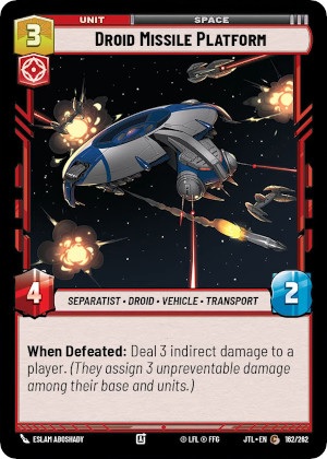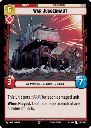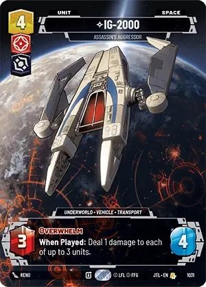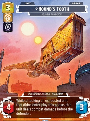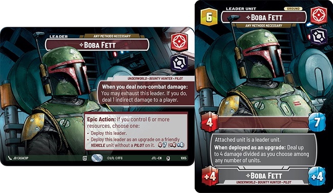 Boba Fett can deploy as an Epic Action as long as you control 6 or more resources. Boba Fett's Leader Unit side is a vanilla 4 power 7 health unit, but Boba's upgrade side is "When deployed as an upgrade: Deal up to 4 damage divided as you choose among any number of units," and gives the upgraded vehicle unit +4/+4 along with making that vehicle a leader unit.