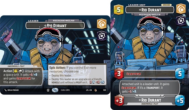 Rio Durant has the leader ability of "Pay 1 resource, exhaust this leader : Attack with a space unit. It gets +1/+0 and gains Saboteur for this attack." and you can deploy Rio Durant to his Leader-unit side at 5 or more resources. Like most Leaders, this is an epic action.